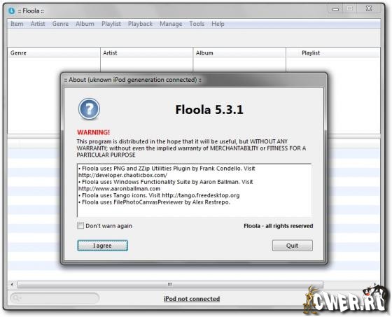 Floola - программа для управления iPod и телефонами Motorola. Позволяет редактировать и синхронизировать данные с компьютером. Кроме этого, Floola позволяет отыскивать продублированные композиции, конвертировать файлы из одного формата в другой, а также работать с подкастами (для этого достаточно добавить URL). Имеется возможность интеграции с популярными веб-сервисами (YouTube, Last.fm).