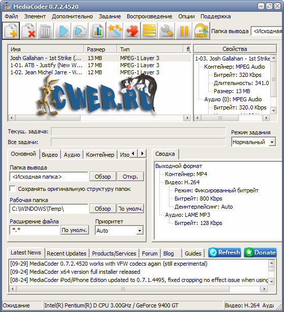 MediaCoder - позволяет повысить компрессию видео и аудио с целью уменьшения размеров файла, может извлекать аудиотреки, предоставляет возможности для конвертирования видео в нормальные VCD/DVD, может осуществлять конвертирование аудио без заметной потери качества, способен создавать копии CD "на лету" и многое другое.