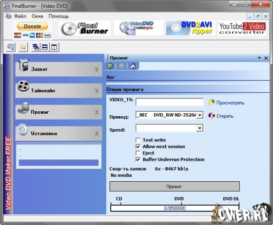 Video DVD Maker может создавать DVD на основе видеофайлов в форматах AVI, DIVX, XVID, MP4, MPG, WMV, ASF, MOV, а также выполнять захват видео с ТВ-тюнера, веб-камеры, DV-камеры и других устройств. Работа программы организована в виде пошагового мастера, и процесс создания диска разбит на три этапа: захват видео, добавление дополнительных файлов, запись DVD. Программа поддерживает запись на любые типы дисков, в том числе двухслойные DVD. Русский интерфейс присутствует.