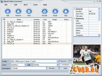 С помощью программы Advanced X Video Converter вы можете конвертировать видео файлы из одного формата в другой. Поддерживаются следующие форматы: AVI (DivX, XviD, MPEG-4...), MPEG (MPEG-1, MPEG-2), WMV/ASF, VCD/DAT и SVCD. Кроме этого, программа позволяет соединять и разделать видеофайлы, а также есть возможность извлекать звуки и изображения из видеофайлов. Advanced X Video Converter обладает понятным интерфейсом и не вызовет проблем при работе даже у неопытного пользователя.