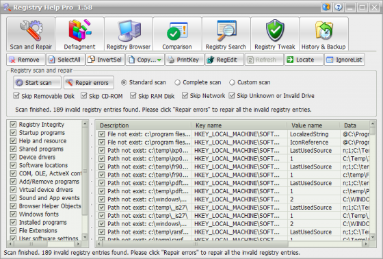 Новая версия программы из серии "твикер системного реестра". Находит ошибки, исправляет, удаляет и т.д. Программе известно большое количество проблем, которые возникают в реестре. Работает быстро и качественно. В программе нет лишних наворотов, она четко знает свое дело. Может производит как быстрое так и глубокое сканирование реестра. Имеет понятный интерфейс.