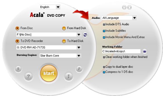 Acala DVD Copy - это приложение для копирования видео DVD дисков. Acala DVD Copy - это копирование содержимого на жесткий диск, прожиг (запись) видео на DVD-R(W), DVD+R(W) носители, копирование DVD-5 и DVD-9 с записью на DVD-9 Dual Layer, сжатие видео с DVD-5, DVD-9 до размеров DVD-5, выбор файлов для копирования или извлечения, удаление ненужных файлов (субтитры, аудио и языковых файлов) с копированного на жесткий диск DVD, автоматическая подготовка проекта к записи на DVD, высокая скорость и качество, простой и удобный интерфейс.