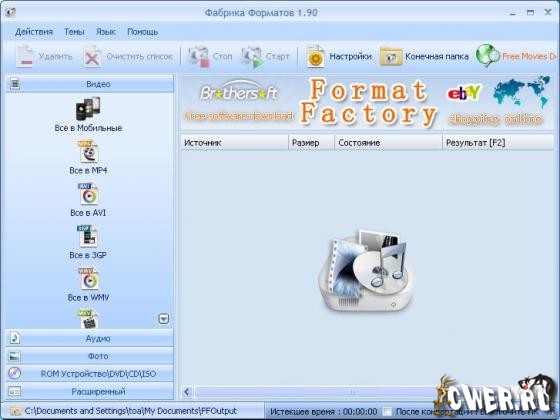 FormatFactory - многофункциональный конвертер различных файлов мультимедиа. Имеет рад дополнительных функций, превращающих FormatFactory в универсальный инструмент для работы с мультимедийными файлами разных форматов. Поддерживается конвертация популярных видеоформатов в MP4, 3GP, MPG, AVI, WMV, FLV, SWF, а также конвертация аудиоформатов в MP3, WMA, MMF, AMR, OGG, M4A, WAV. В FormatFactory есть функция преобразования изображений в форматы JPG, BMP, PNG, TIF, ICO, GIF, PCX, TGA. Среди дополнительных возможностей FormatFactory есть такие, как увеличение и вращение изображений, присвоение им тегов, а также восстановление поврежденных аудио и видеофайлов.