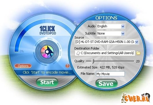 Конвертировать Ваши любимые фильмы и другие видео ролики формата DVD в формат плеера iPod всего одним щелчком. В отличие от других программ со сложными настройками, длительным и сложным процессом конвертирования, программа 1Click DVD To IPOD очень удобна. Видео или кинофильм программа находит сама автоматически и не требует от вас предварительного просмотра, вам остается выбрать нужный кинофильм или видео ролик, который вы хотите получить на вашем плеере Ipod. Всего лишь кликните по кнопке Start и получайте сконвертированный видео файл, пригодный для Ipod.