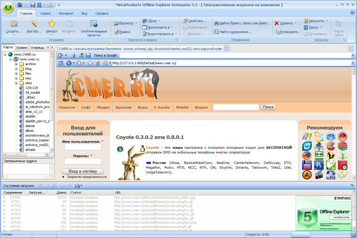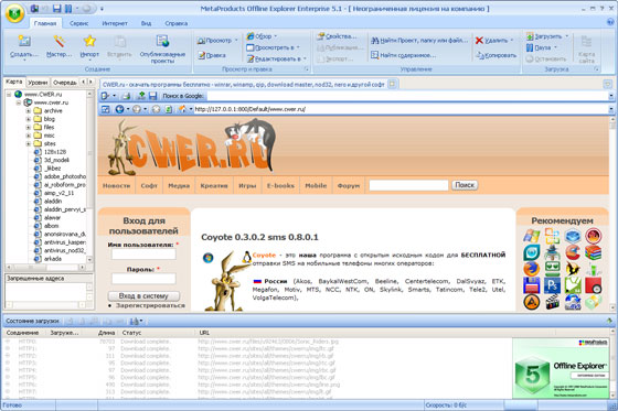 Offline Explorer Enterprise - Мощнейшая программа, позволяющая скачивать как отдельные файлы, так и целые веб-сайты (HTTP, FTP и HTTPS) на жесткий диск для их последующего офф-лайн просмотра как на отдельном компьютере, так и пользователями локальной сети - в программу встроен внутренний HTTP-сервер.