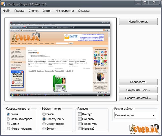 Windows Snapshot Maker - программа с понятным интерфейсом для съёмки скриншотов с несколькими режимами: полный экран, активное окно, окно программы, выделенная область. Возможно применение различных эффектов: вставка "подписи" (т.е. watermark в виде графического файла), контур, тень, поворот, масштабирование, коррекция цвета.