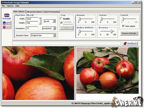Вы когда либо хотели вмешаться и получить больший контроль над процессом увеличения фотографий? Теперь это возможно, с новыми инновационными технологиями в этом автономном приложении! Простые автоматические настройки программы делают Reshade Image Enlarger прекрасным выбором для начинающих, а наличие расширенных параметров настроек позволяют ее рекомендовать для профессионального использования. Никакой другой инструмент изменения размеров изображения на рынке ( Photoshop и третьи программы включительно) не позволяют вмешаться в этот процесс, как это предлагает Reshade Image Enlarger. Она выдает точное, высококачественное и реалистичное увеличение при любом коэффициенте масштабирования.