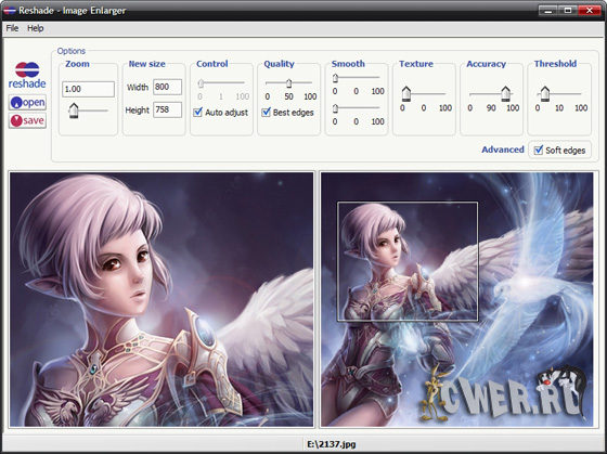 Reshade Image Enlarger - еще одна замечательная (и что немаловажно - бесплатная) программа для увеличения цифровых фотографий с уникальным алгоритмом работы, позволяющим масштабировать изображения до 2000% с минимальной потерей качества. Программа имеет как автоматический, так и ручной режимы работы, предоставляя возможность плавно контролировать весь процесс увеличения.